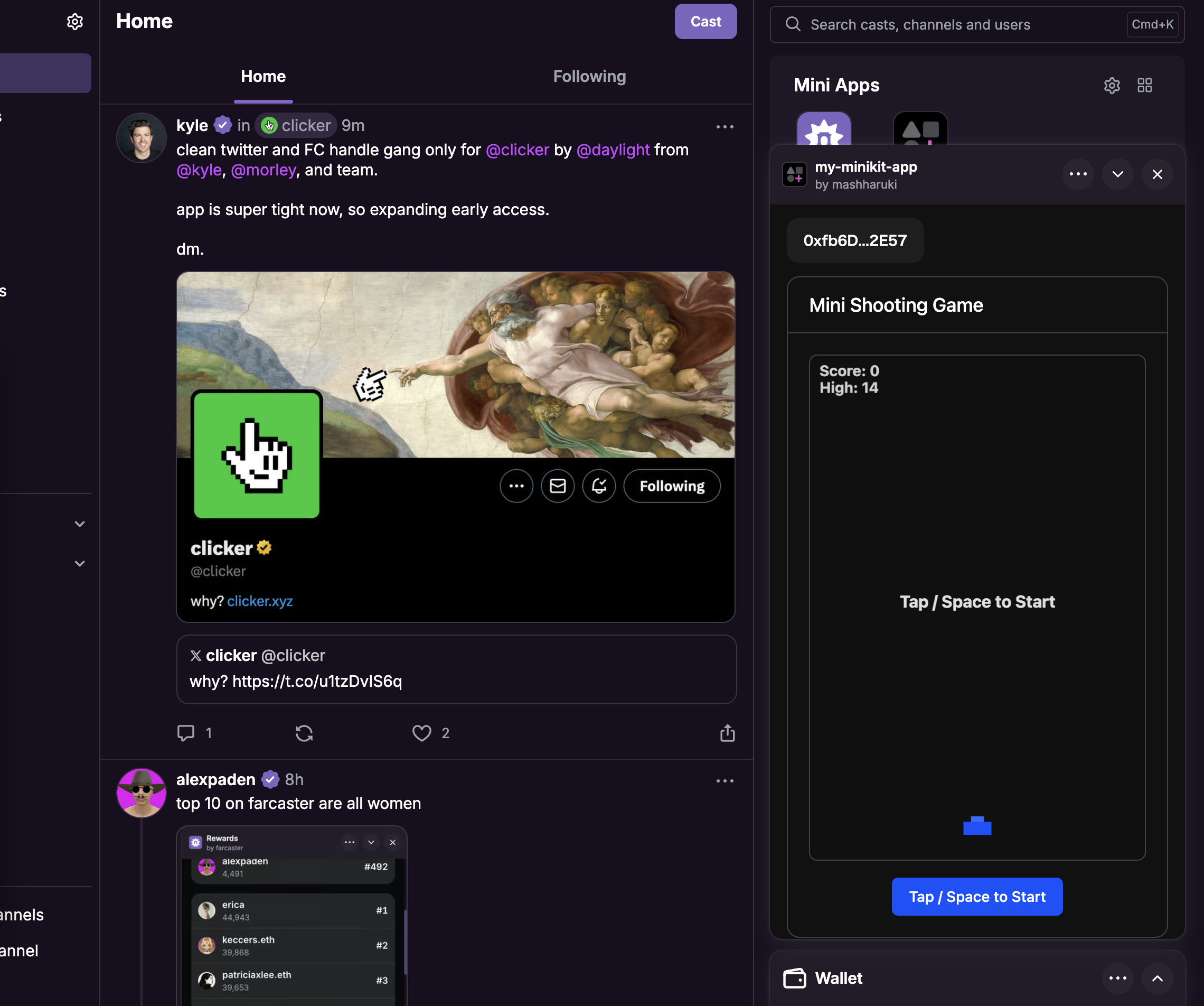 このプロジェクトのゴールは、以下の画像のように、Farcasterのフィード上で直接起動し、プレイできるシューティングゲームを開発・公開することです。ゲームをプレイし、倒した敵の数に応じてNFTをミントする機能を実装します。
