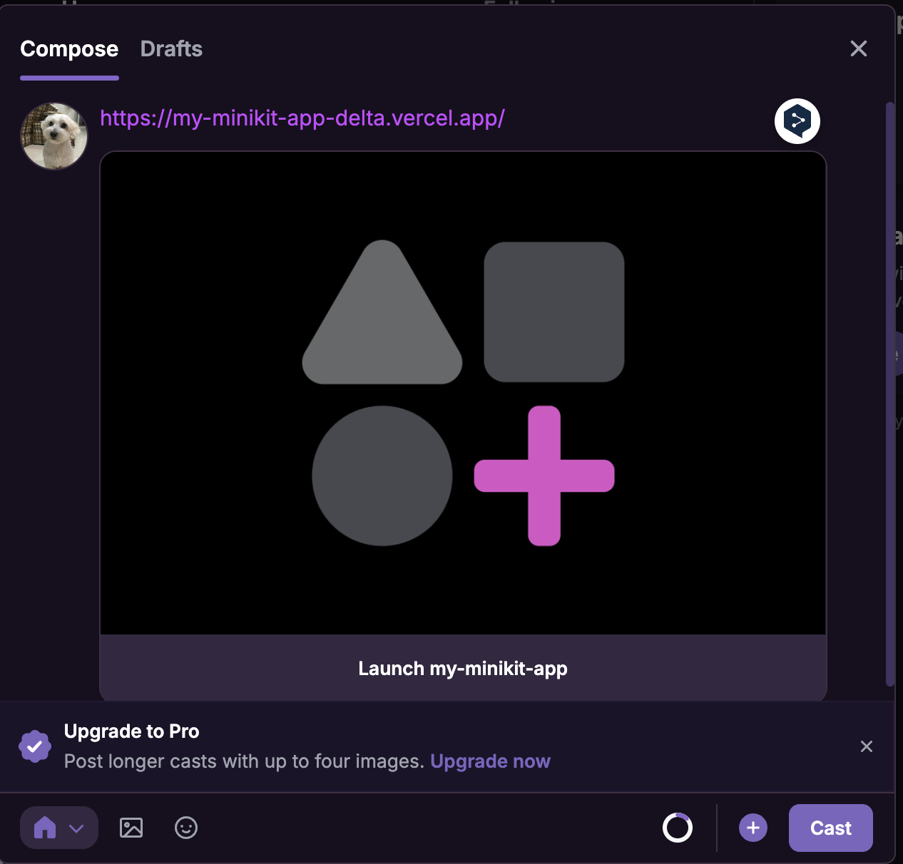 )を貼り付けます。 - URLを貼り付けると、Farcasterが自動的にメタデータを読み込み、Mini Appのプレビューが表示されるはずです。