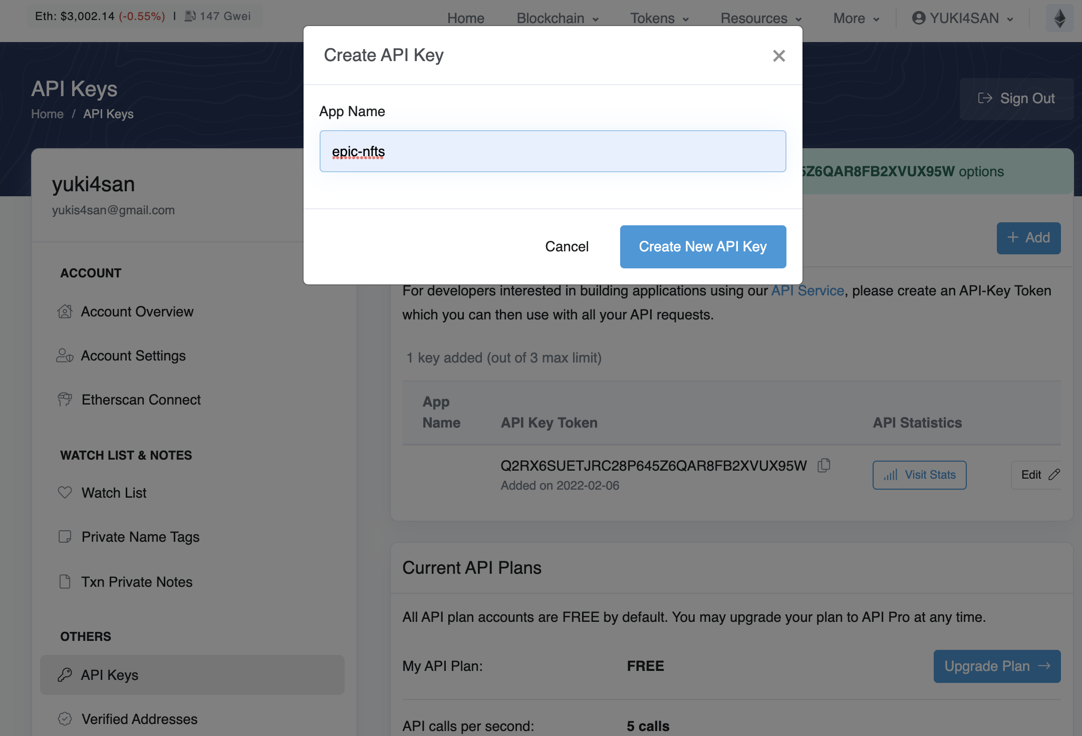 まず、Etherscanのアカウントを取得して、apiKey