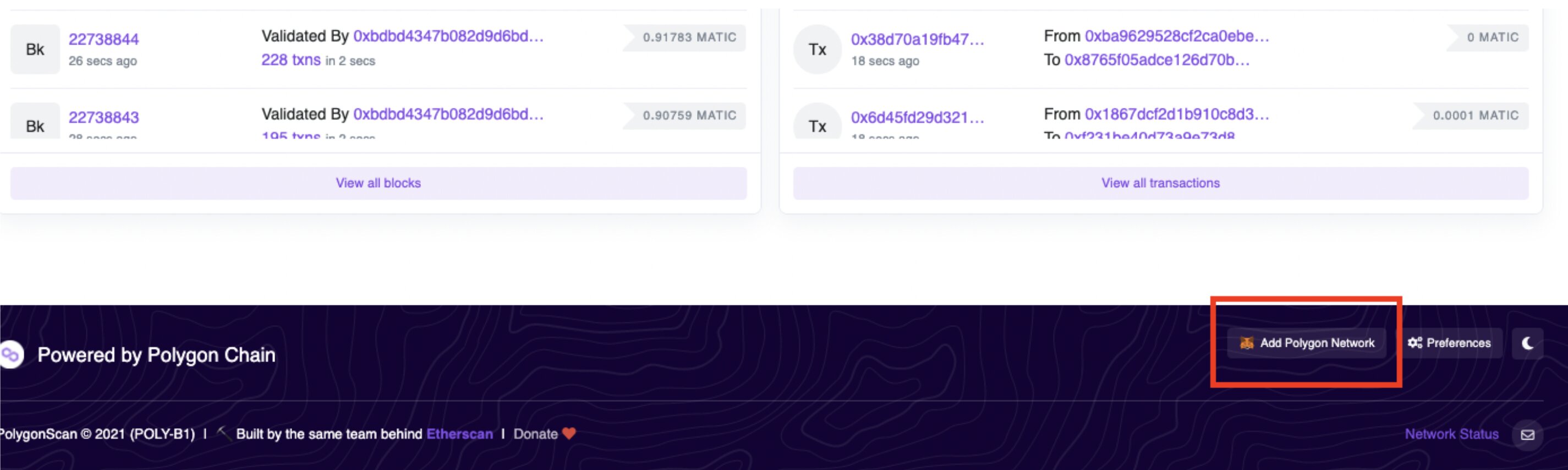 まず、Polygonscan に向かい、ページの一番下までスクロールして、Add Polygon Network