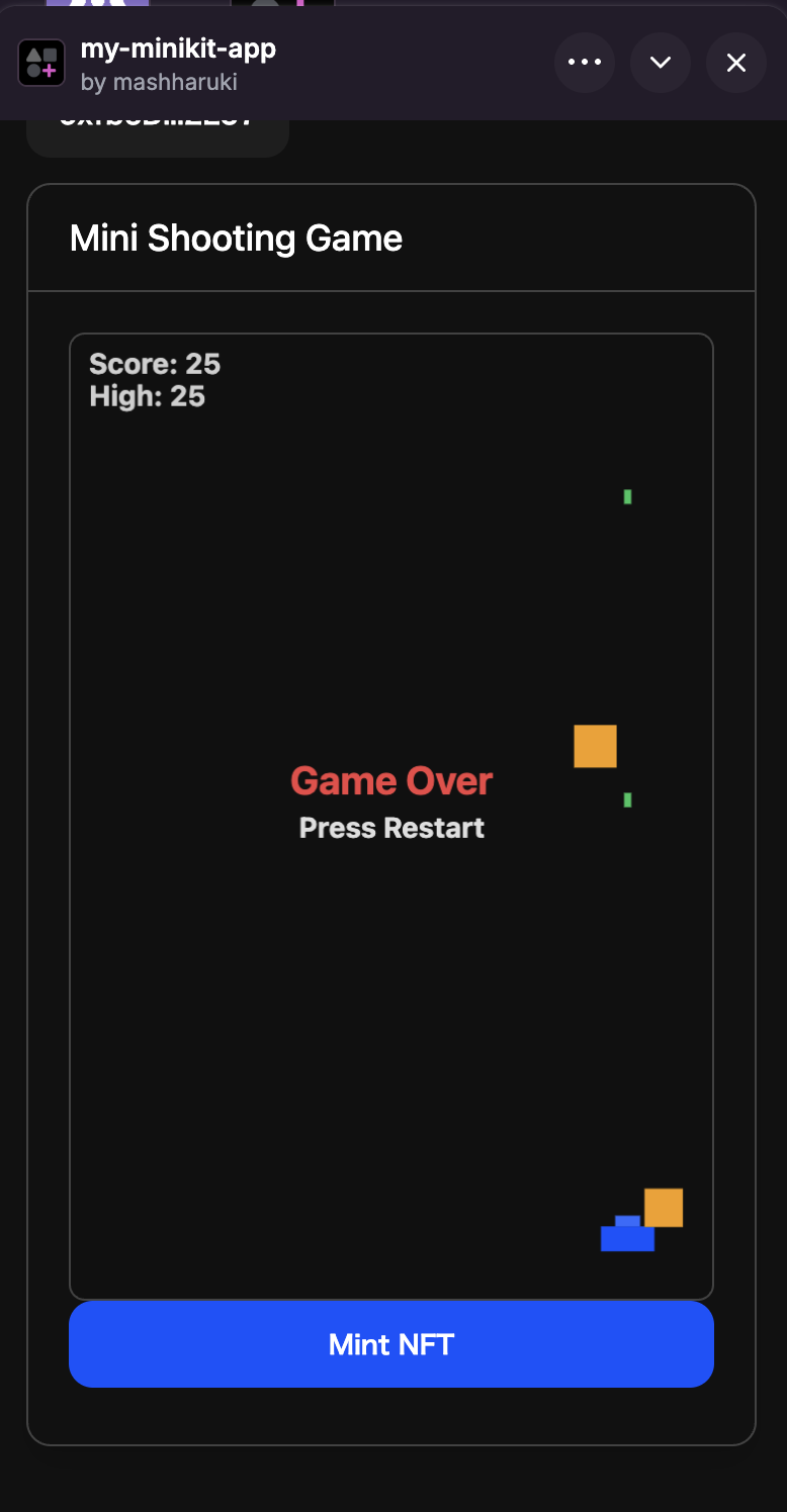 このプロジェク トでは、Baseブロックチェーン上で動作する Mini App「Mini Shooting Game」 を開発します。