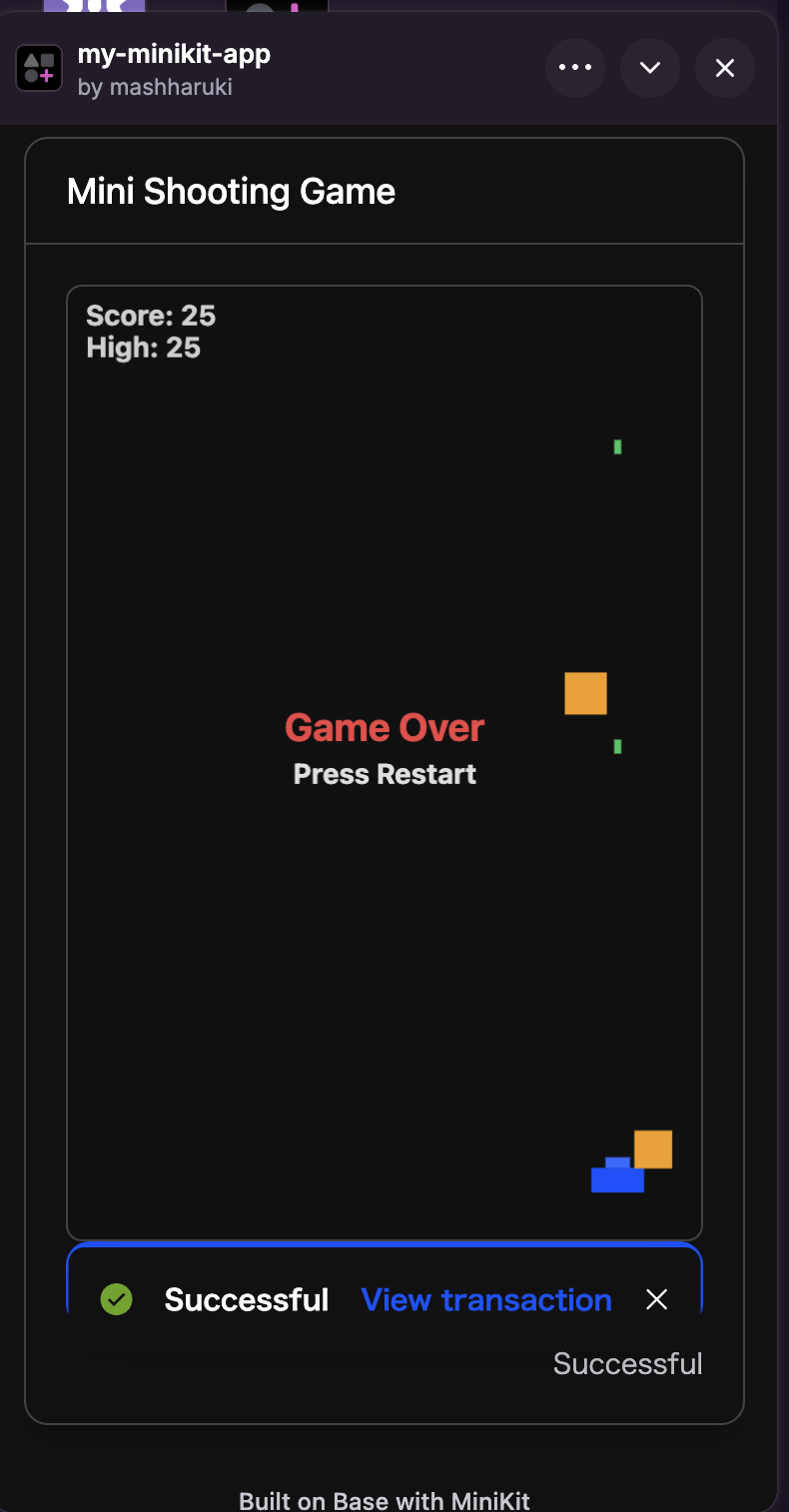 - NFTミント: ゲームオーバーになると、スコアと「Mint Score NFT」ボタンが表示されます。ボタンをクリックすると、ウォレットがトランザクションの確認を求めてきます。