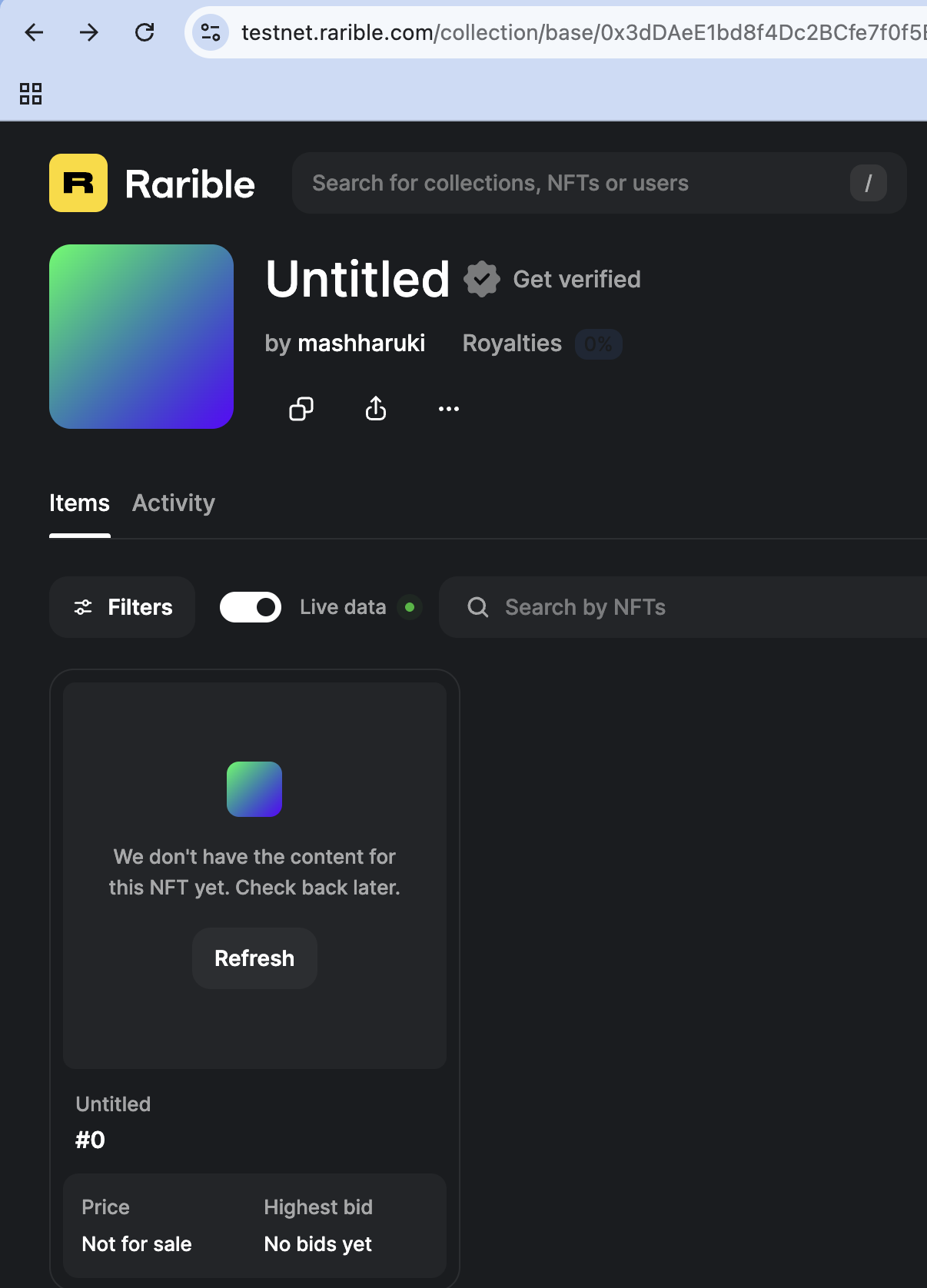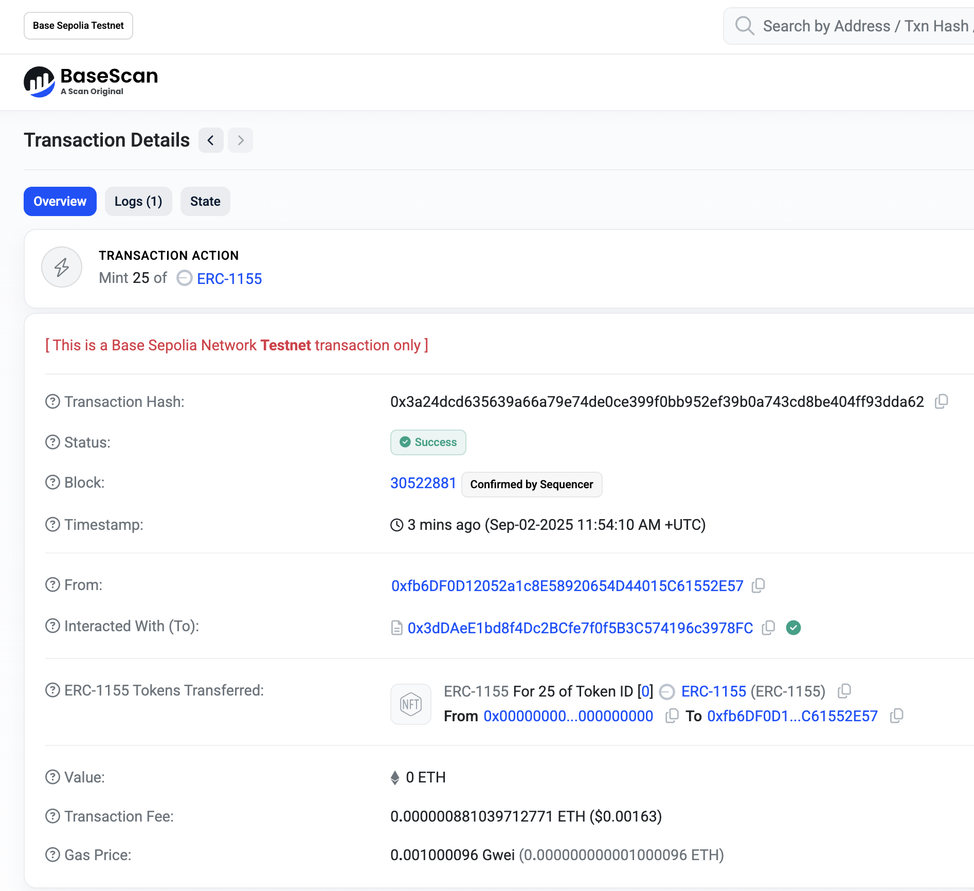 のリンクをクリックすると、Basescanが開き、ミントされたNFTのトランザクション詳細を確認できます。倒した敵の数(スコア)と同じIDのNFTが、あなたのアドレスにミントされていれば成功です!