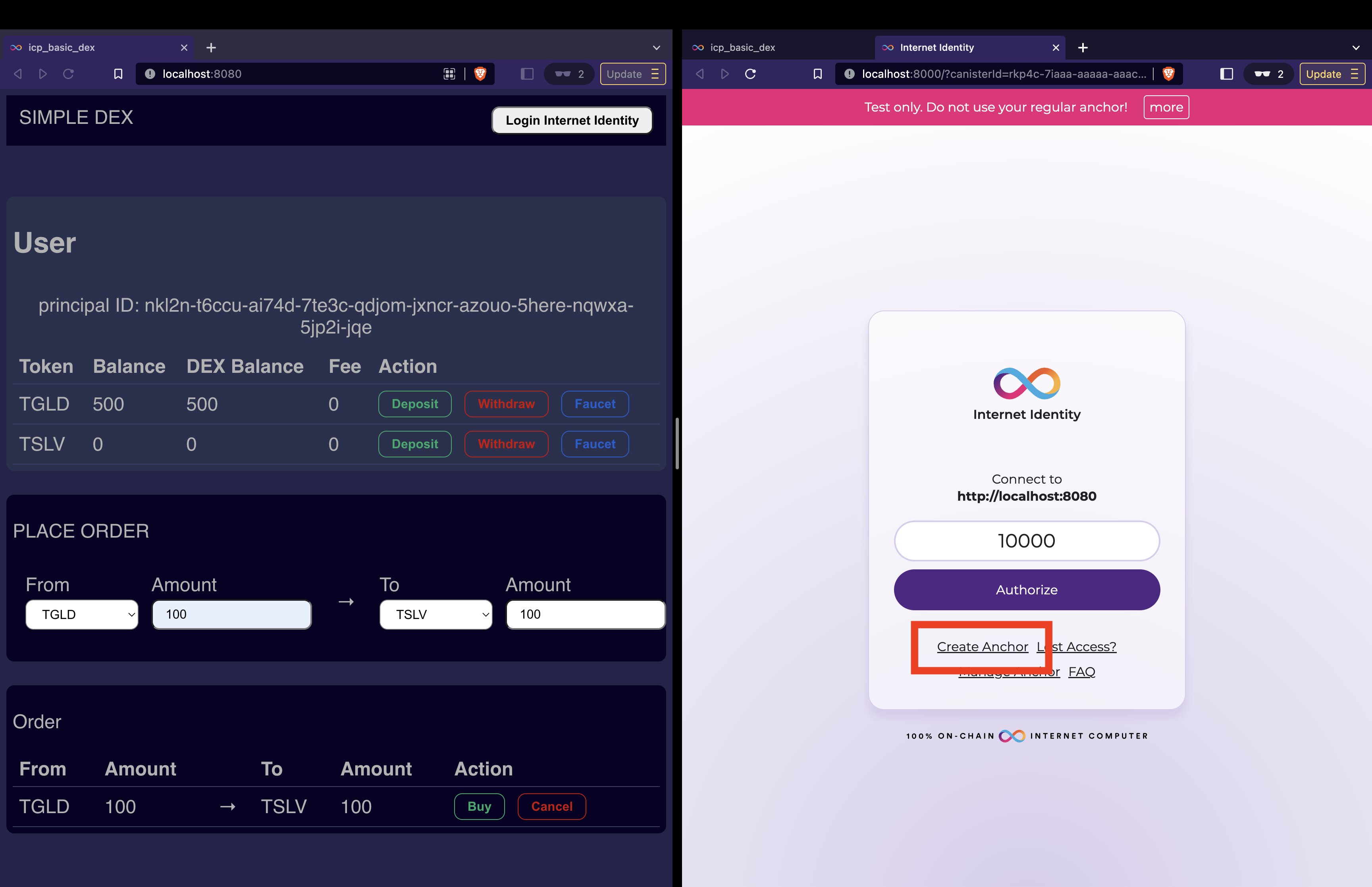 今度は、オーダーが購入された画像左(ユーザー GLD)の残高が更新されているかを確認してみます。ユーザーボードを更新するために、画面のリロードを行いましょう。オーダーを購入したユーザーと同じPrincipalが表示されてしまうので、再度ログインをし直します。アンカーを入力して、Authorizeボタンを押します。