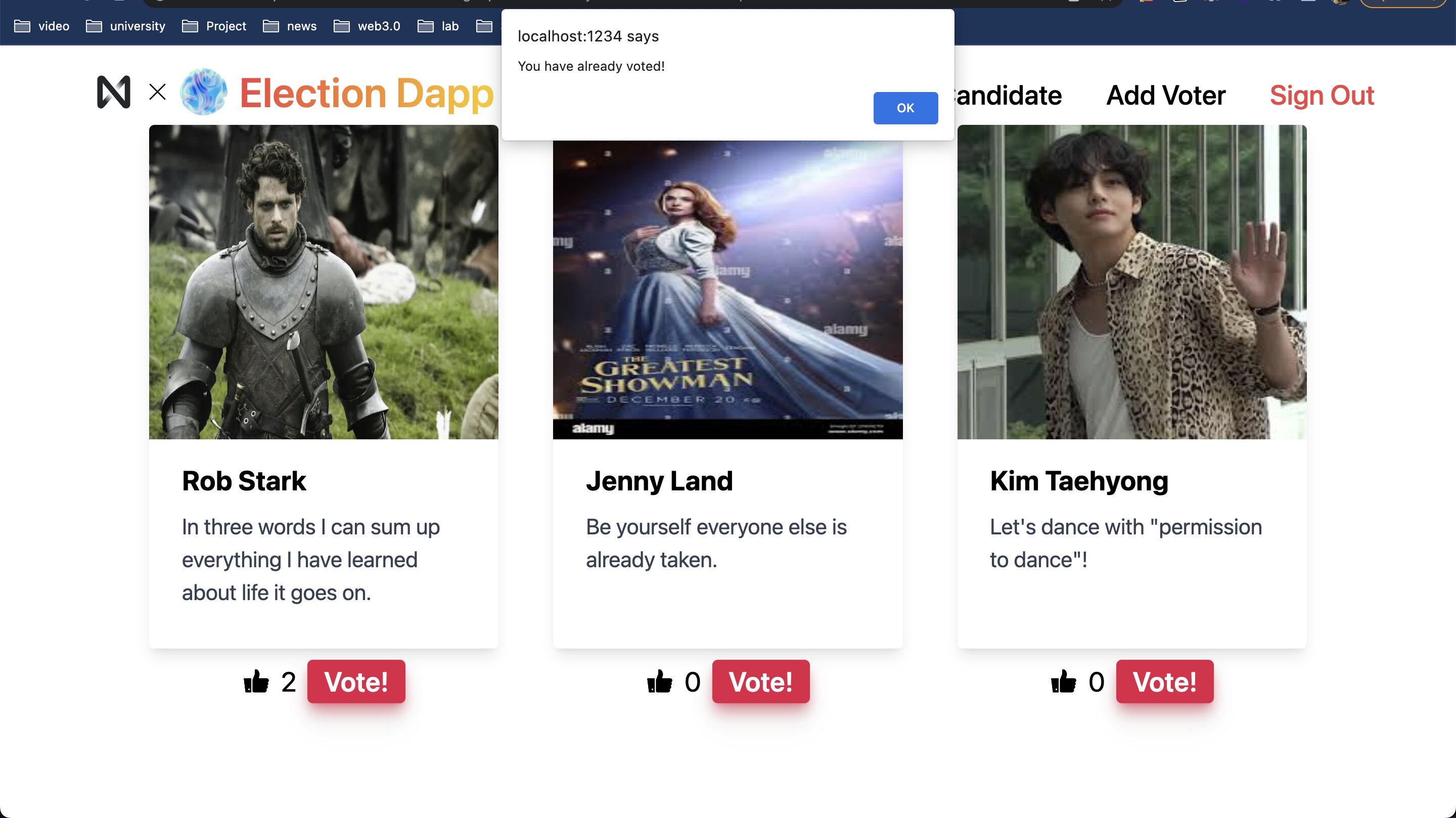 を押してみましょう。次のようにすでに投票していることがメッセージで来ていたら成功です!